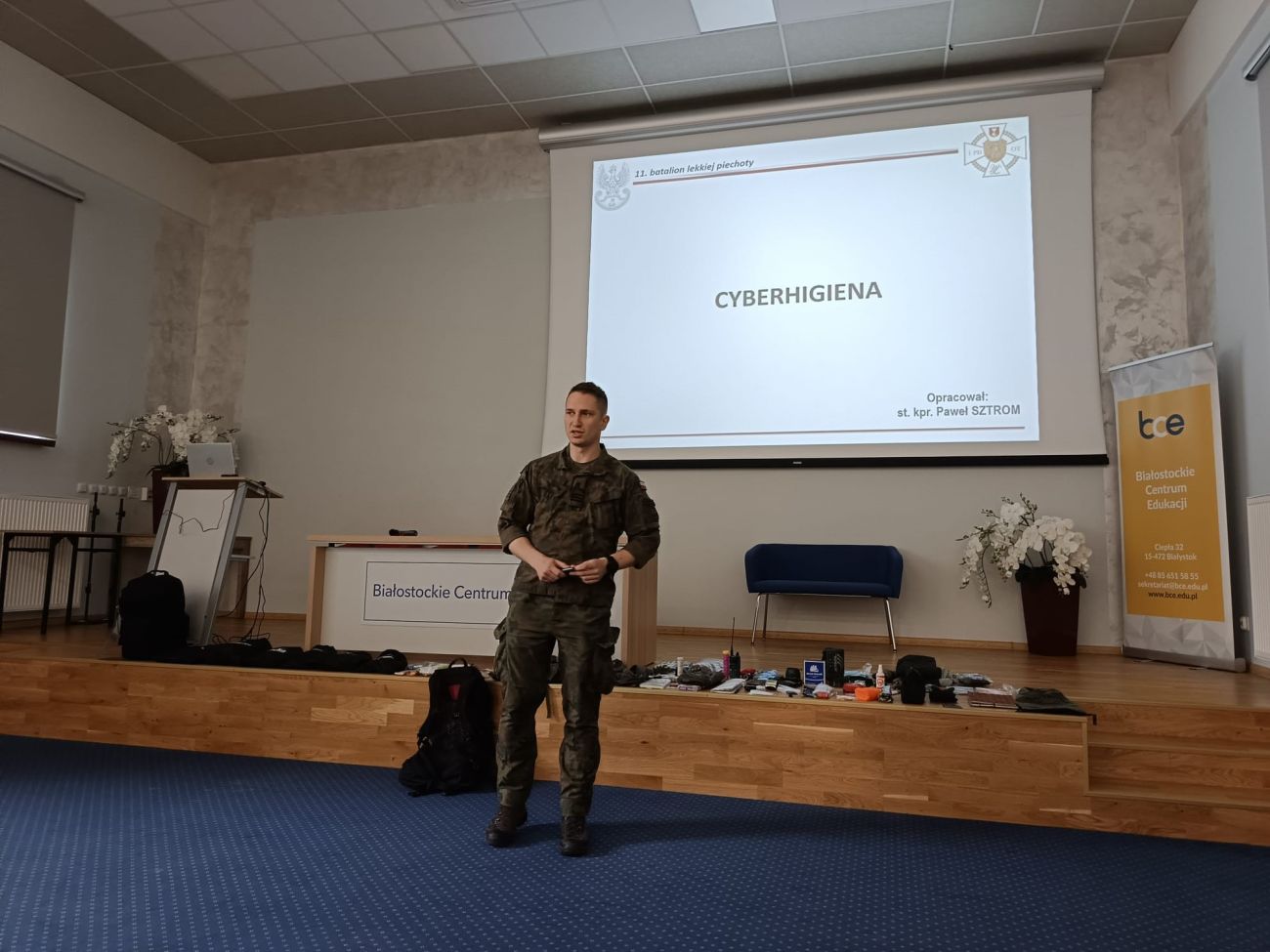 15 kwietnia w Białostockim Centrum Edukacji odbyło się szkolenie z zakresu bezpieczeństwa i przygotowania do reagowania w sytuacjach kryzysowych. Zajęcia zostały profesjonalnie poprowadzone przez żołnierzy 11 batalionu lekkiej piechoty. Uczestnicy mieli okazję zdobyć i przećwiczyć kluczowe umiejętności takie jak: przygotowanie siebie i swojego otoczenia na sytuację zagrożenia, sygnały oraz sposób alarmowania, przygotowanie plecaka ewakuacyjnego, pierwszą pomoc, ocenę poszkodowanego i użycie AED.